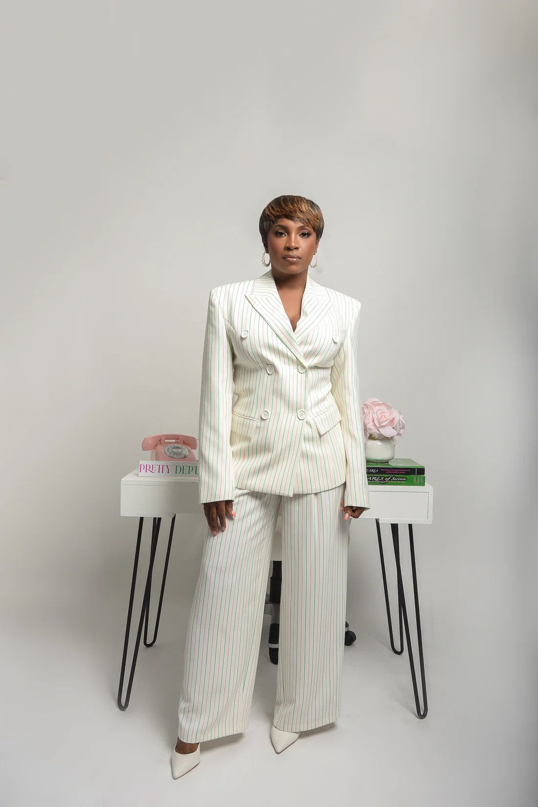Make a statement in our signature pink-and-green pinstriped, double-breasted blazer. With sharp shoulders, luxe button detailing, and a cinched waist - it’s sculpted for a sleek, feminine silhouette. Crafted from premium fabric with functional pockets, this is the ultimate power piece, made to be dressed up/down, or paired with various pieces in the Standing on Business Collection.