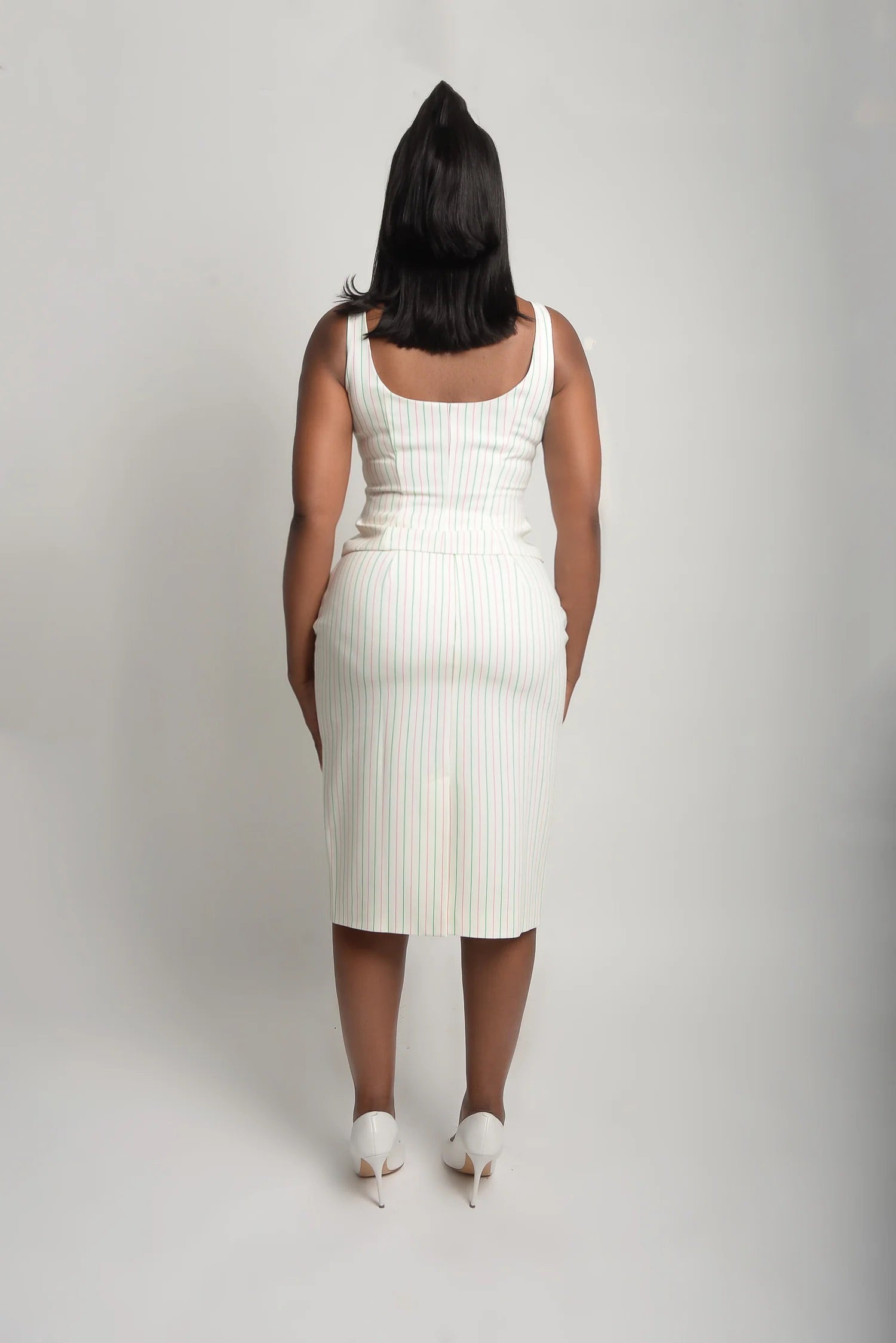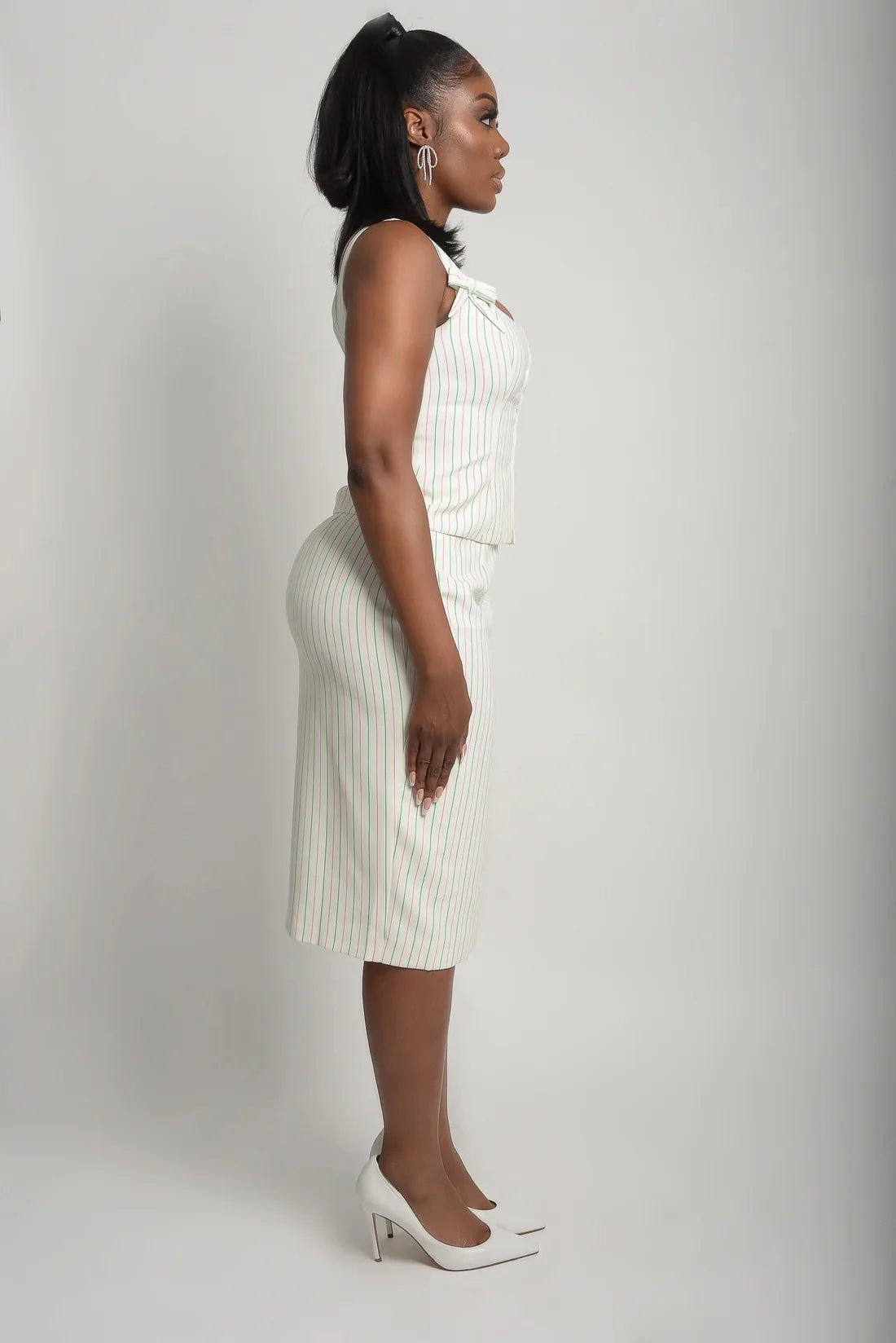 Command attention in this tailored bustier, cut to sculpt and flatter with precision. Made from our signature pink-and-green pinstripe, it features structured seaming and sleek front hook-and-eye closures for a contoured fit. Removable shoulder bows add a feminine, playful accent, giving you the option to style it boldly on its own or layered over a crisp button-up for modern sophistication.