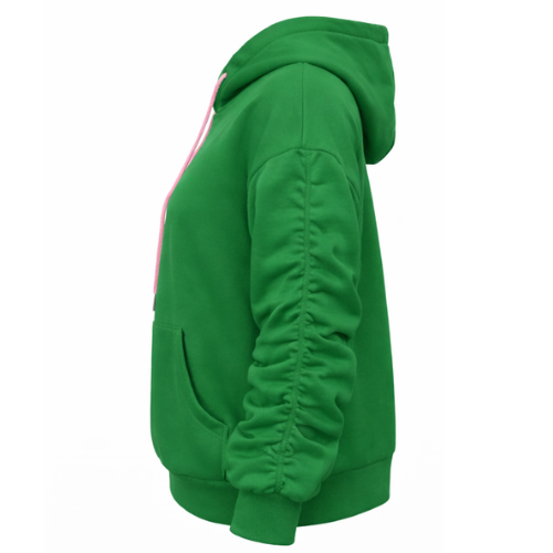 Stay warm while representing Beta Alpha Omega in elevated comfort and bold chapter pride. This premium green hoodie features the iconic ΒΑΩ lettering across the chest with “The Mother Pearl of New Jersey” scripted beneath, creating a clean yet statement-making design that stands out at chapter events, casual outings, or everyday wear. Constructed from a thick, high-quality cotton-blend fleece, this hoodie delivers warmth, durability, and a soft interior feel you’ll reach for again and again. The relaxed fit, ribbed cuffs, and spacious front pocket provide both comfort and function, while the pink drawstrings and sleeve detail add a refined touch of soror style. Details Soft cotton-blend fleece interior Mid-to-heavy weight fabric for warmth and structure Relaxed, true-to-size fit Adjustable drawstring hood Front kangaroo pocket Ribbed cuffs and hem for durability Signature green and pink chapter colorway Designed for layering or wearing on its own, this hoodie blends comfort, quality, and chapter representation into one essential piece.